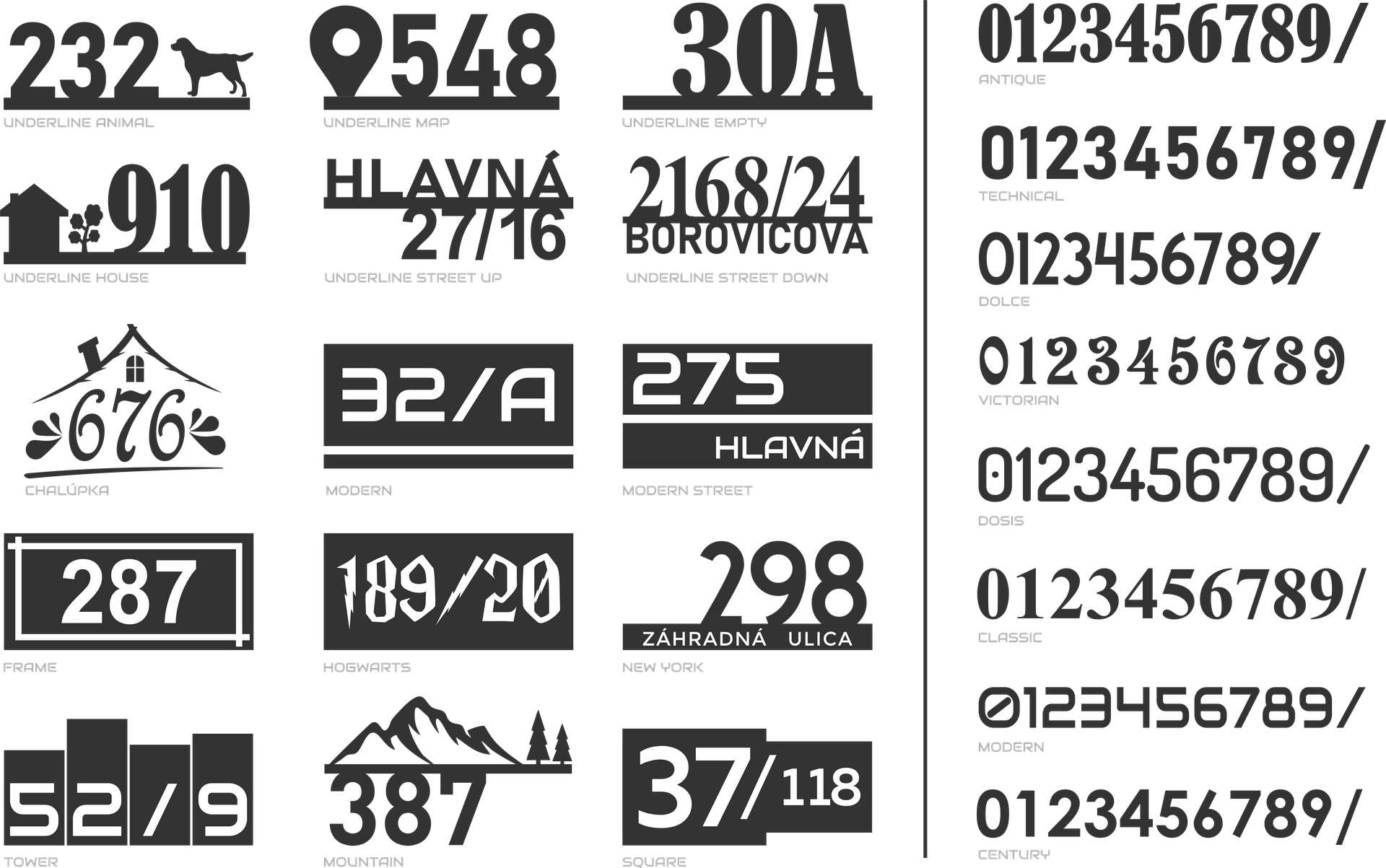 Popisné čísla patria k neoddeliteľnej súčasti každodenného života. Stretávame sa s nimi každý deň pri rôznych príležitostiach. My Vám vytvoríme popisné číslo presne podľa Vašich požiadavok v najvyššej kvalite. V katalógu čísel si stačí vybrať typ, farbu a veľkosť. Ak máte vlastný nápad alebo špeciálnu požiadavku, radi Vám vytvoríme číslo podľa vlastného návrhu. Samozrejmosťou sú moderné podsvietené LED čísla.